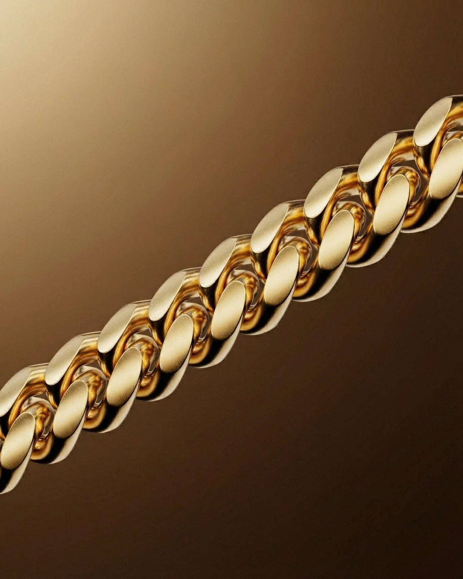 A richer gold tone with a finish that holds up close. Each link is fully finished for consistent coverage and depth — so the shine reads clean, even in harsh light. We use a specialized gold finish made with real gold, applied thicker than standard plating, for that solid, gold-feel you notice the moment you put it on.